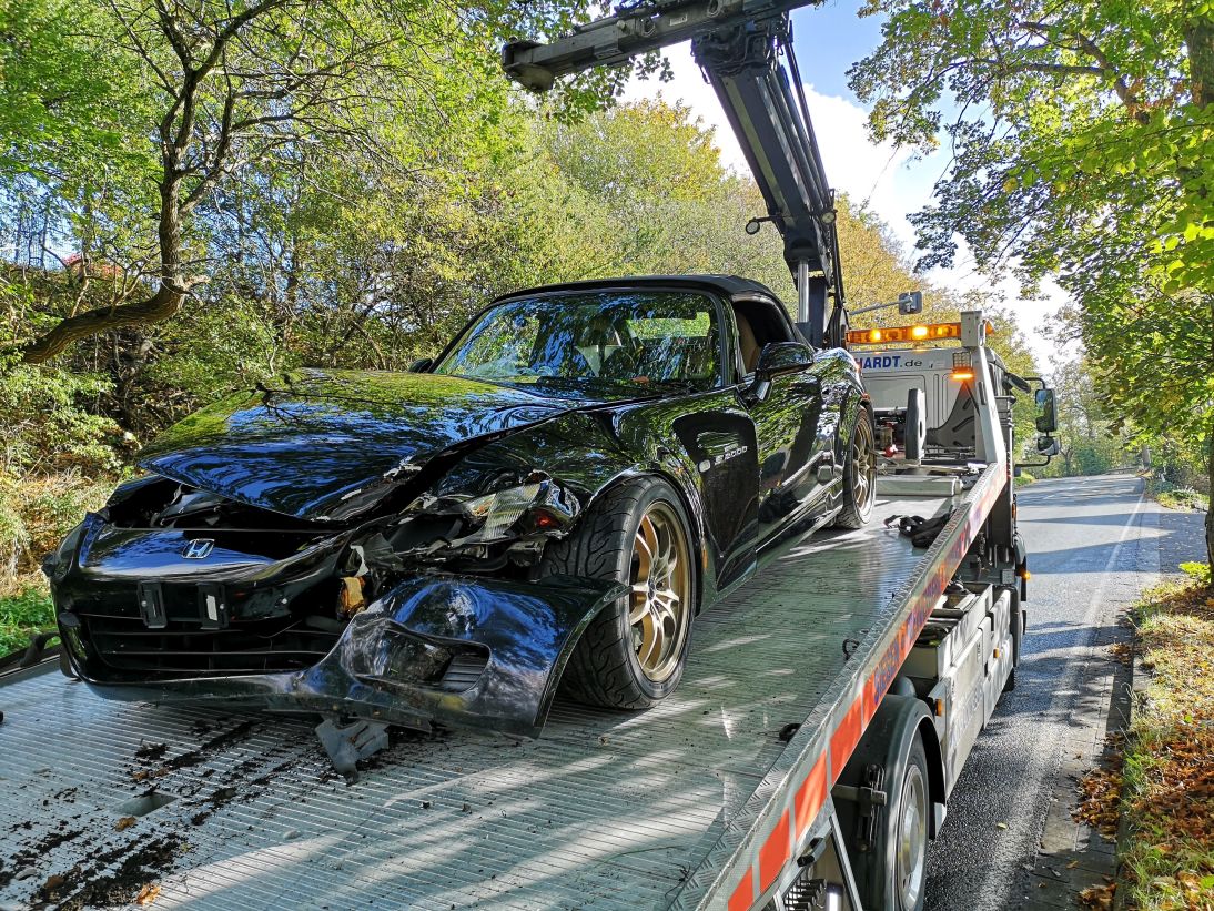 Wie auch immer, ähnlich schön sollte es auch am vergangenen Sonntag sein, mein Töchterchen und ich wollten über Land zur Oma. Wir sind nicht wirklich weit gekommen, Ortsausgang, relativ steil bergauf, leichte Rechtskurve, ca. 45 km/h im dritten (!) Gang cruise modus und vor mir ist noch einer abgebogen, etwas feucht. Dann wie der Blitz (ähnlich dieser Platte beim Fahrsicherheitstraining) hinten links weg - reflexartig dagegen gelenkt - hat nicht funktioniert - rumms an einen dicken Baum, hauptsächlich mit der Front Fahrerseite. Airbags auf, Kind weint.