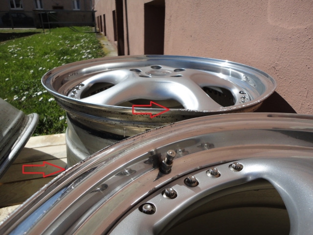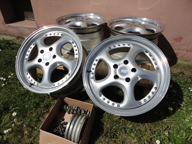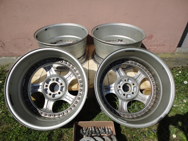 Alle Felgen wurden ohne Reifen auf der Wuchtmaschine geprüft und weisen keine Unwucht oder Höhenschlag auf. Da es sich hier um echte dreiteilige Felgen handelt, kann das Felgenhorn ausgetauscht werden. Nach meiner Einschätzung wäre dies nur an einer beschädigten Felge nötig, die bordsteinseitig montiert war.