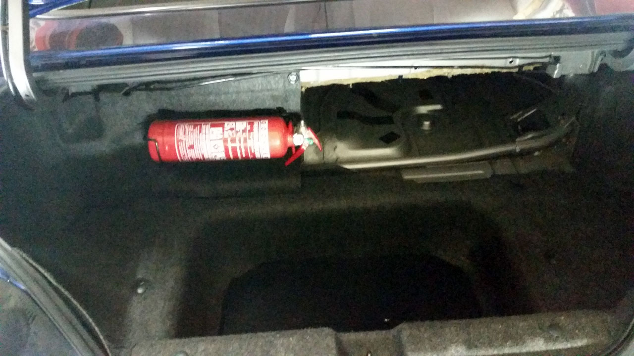 Hab auch meinen kofferraum wieder zurück gebaut auf "Original". Da war ein Holzboden drin wg. der Batterie und so was. Links in der Abdeckung war ein Loch, hab ich gleich genutzt um dort meinen Feuerlöscher zu montieren. Rechts die Abdeckung hab ich zwar, aber die bleibt Weg und will den raum mit Filz auslegen damit ich mehr Stauraum hab.