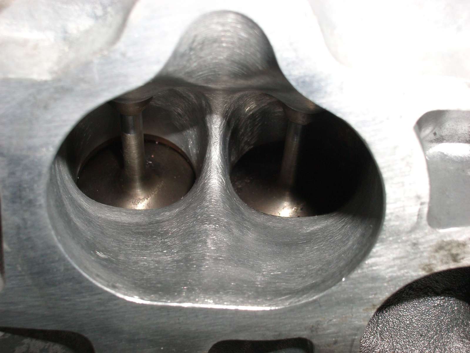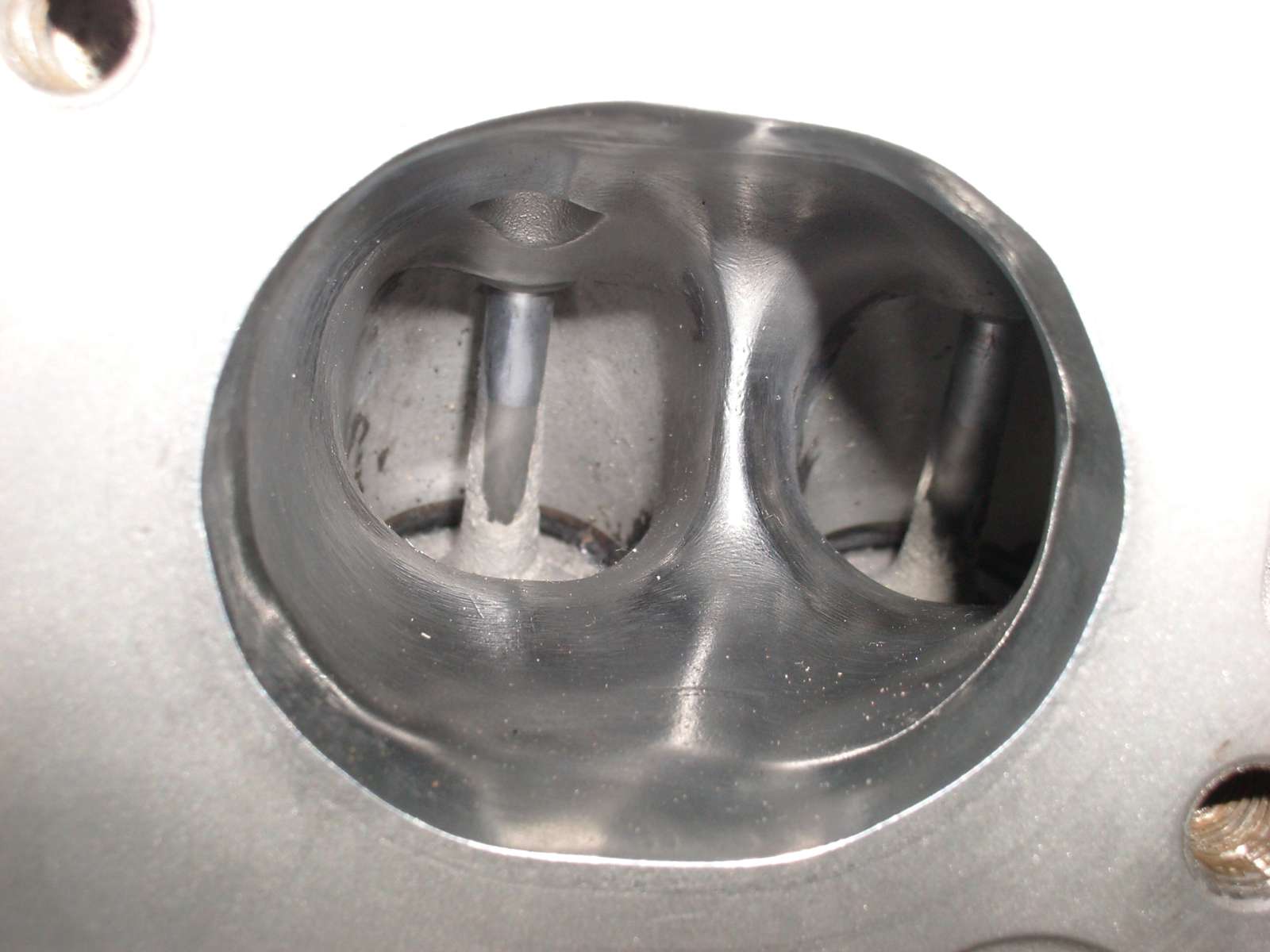 Man sieht das die Einlassventile schon sehr dicht am Rand des Brennraums liegen. Ich hatte auch erst überlegt ob ich größere Ventile nehmen soll, aber dann wird die Strömung durch die Zylinderwand gestört und man hat keinen ringförmigen Strömungsquerschnitt mehr. Das wird sich bei hohen Drehzahlen bemerkbar machen dachte ich und hab's gelassen. Ich habe sogar jeweils kleine Taschen in den Brennraum gefräst damit die Strömung dort nicht behindert wird.