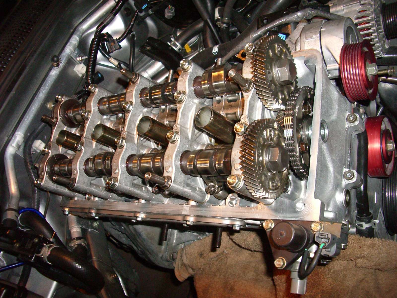 hier mit Nocken-/Ketten-rad montiert und Kettenspanner wieder drin (u.re. im Bild)
