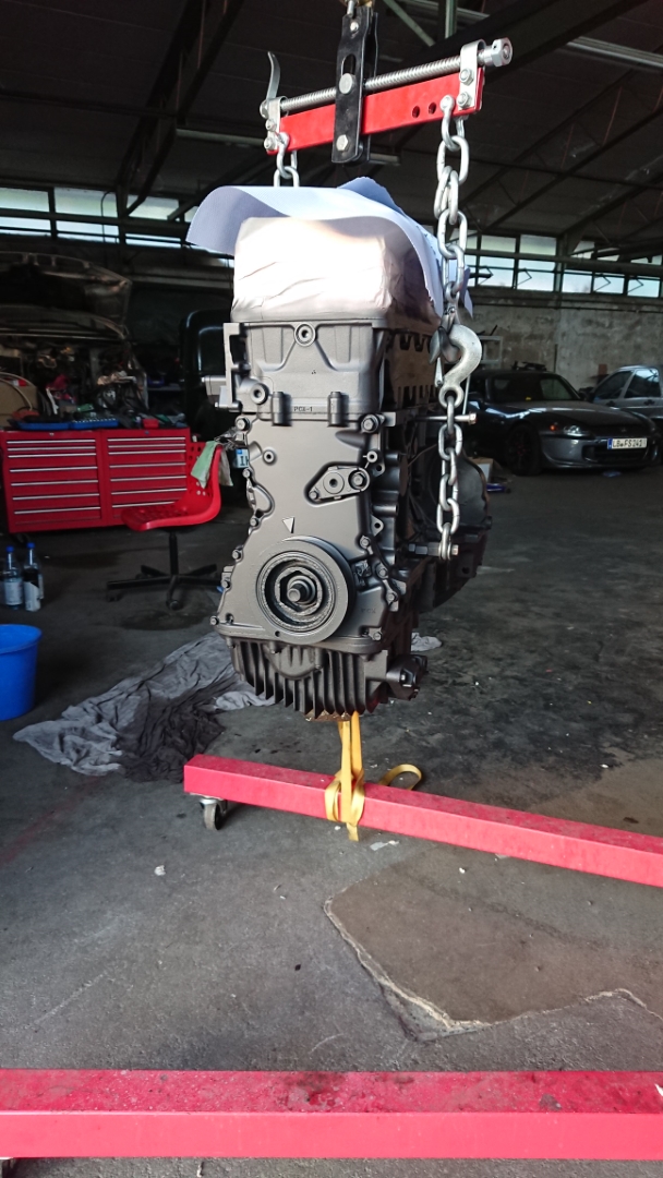 Motor ausgepackt und direkt an den Kran gehangen. Vor dem Einbau sollte alles nochmal frisch geschrubbt und vor allem schwarz matt lackiert werden.