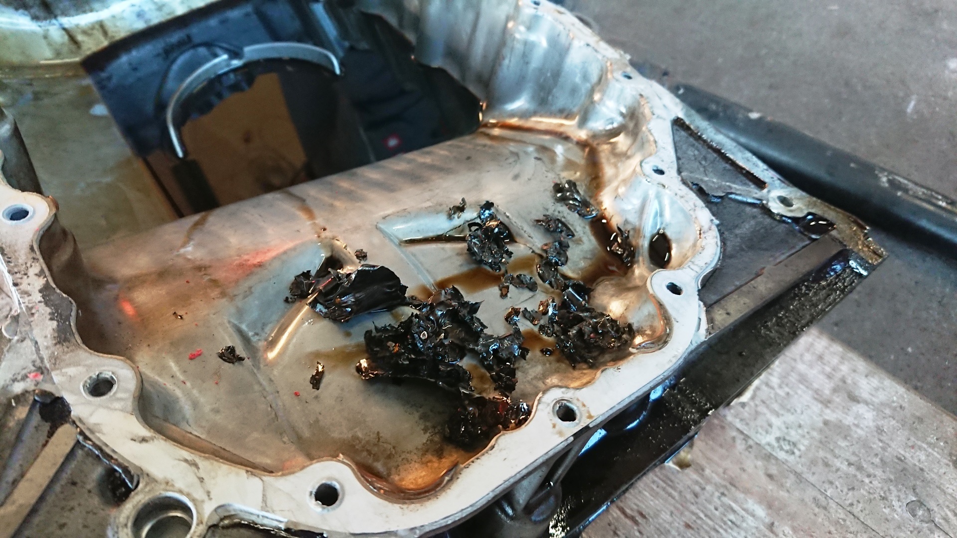 Auto auf die Bühne, in Ruhe die Ölwanne ab und gucken was los ist. Nanu was schwimmt da denn im ÖL. Da sieht ja aus wie große platte Bohrspäne. Auch im Ansaugstutzen der Ölpumpe hängt ziemlich viel zeug davon.