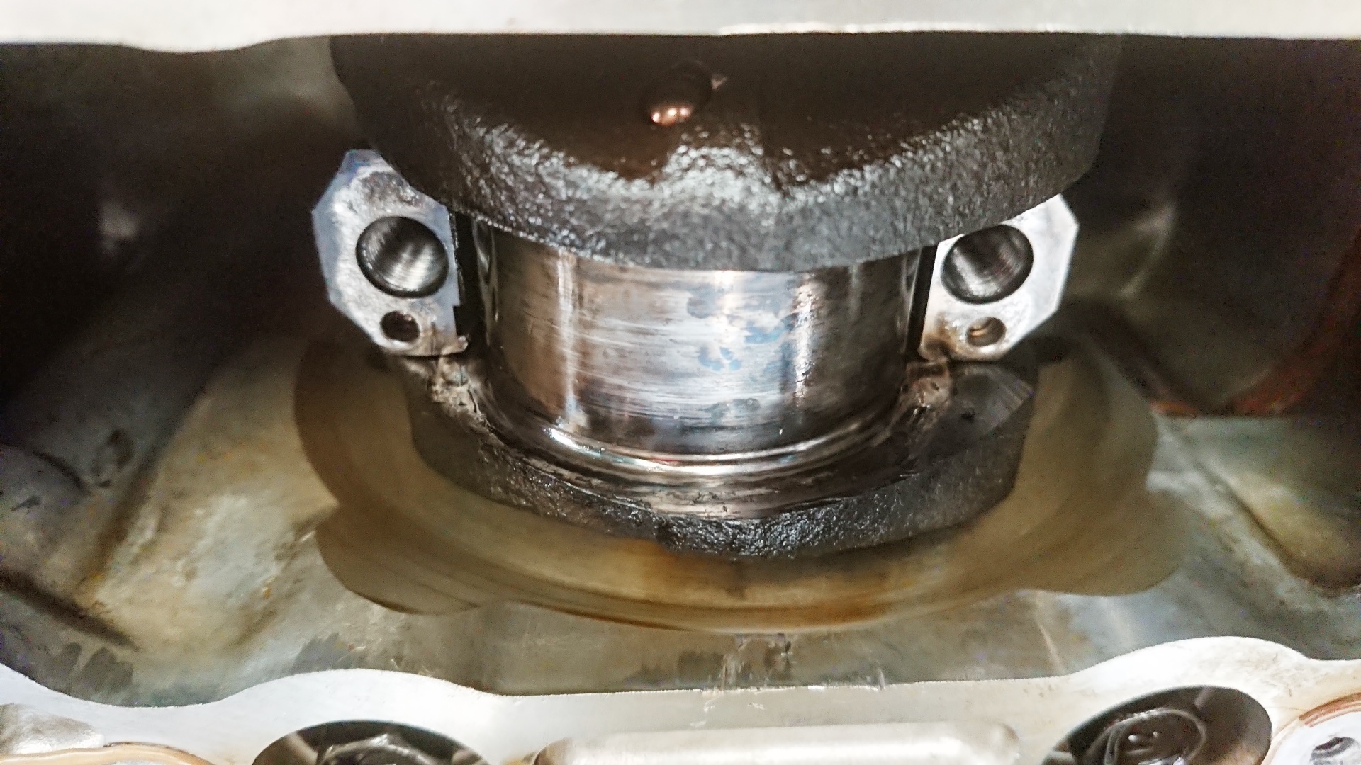 Untere Hälfte vom Pleuel demontiert. Tja, wo keine Lagerschale mehr ist, muss natürlich viel Spiel sein. Sowohl die obere als auch untere Lagerschale waren wirklich nicht mehr existent. Sowas habe ich noch nicht gesehen. Durch die neue Beweglichkeit des Pleuels hatte auch die Kurbelwelle ordentlich was abbekommen.