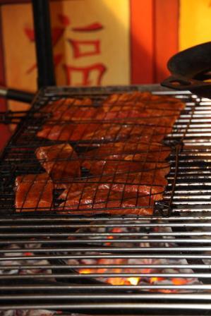 Am Grill bereiten wir Lachs oder wer möchte Fleisch, Würstchen auf Vorbestellung zu.