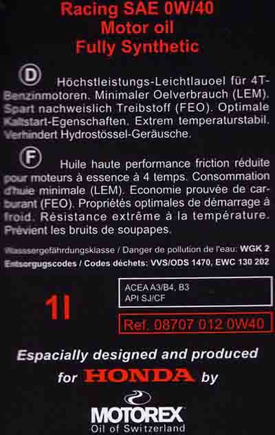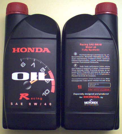 Ich war jetzz in meiner Garage und habe dabei auch alle hoffnung aufgegeben, irgendwie das perfekte Öl für meinen Wagen zu finden! Werkstat Chef kommt mit dem bestellten Öl, kurzer blick meiner Seit´s. 0W-40 ich glaube es wirklich langsam nicht mehr...! Darauf habe ich mit ihm gesprochen (er redet sonst nicht viel, ist ja auch kein Verkäufer sondern ein Mechaniker) wobei er mir erklährte das er nach dem Gespräch mit mir am Montag mit einem Herr XY von HONDA gesprochen hat, welcher für den Technischen Dienst und auch für die Garantiefälle Zuständig ist und dieser im genau das Öl empfohlen hat, es ist übrigens von MOTOREX einfach mit einem Grossen HONDA schriftzug versehen in einer schönen Flasche... Der Preis ist schon ein bischen heftig 24.50sFr oder etwa 16Euro! Im grossen und ganzen kann ich einfach sagen das nächste mal nehme ich das Öl was mir gefällt...!