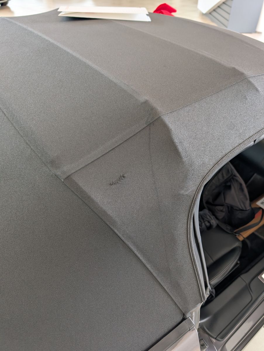 Was mich leider negativ überrascht hat: Das Verdeck ist an einer kleinen Stelle (etwa 3cm) geflickt. Stört mich deshalb, da vorher nicht kommuniziert + und der Rest des Verdecks wie neu aussieht. Ich vermute, dass hier mal mit einem Messer eingestochen wurde. Da muss sich der Händler noch was einfallen lassen.