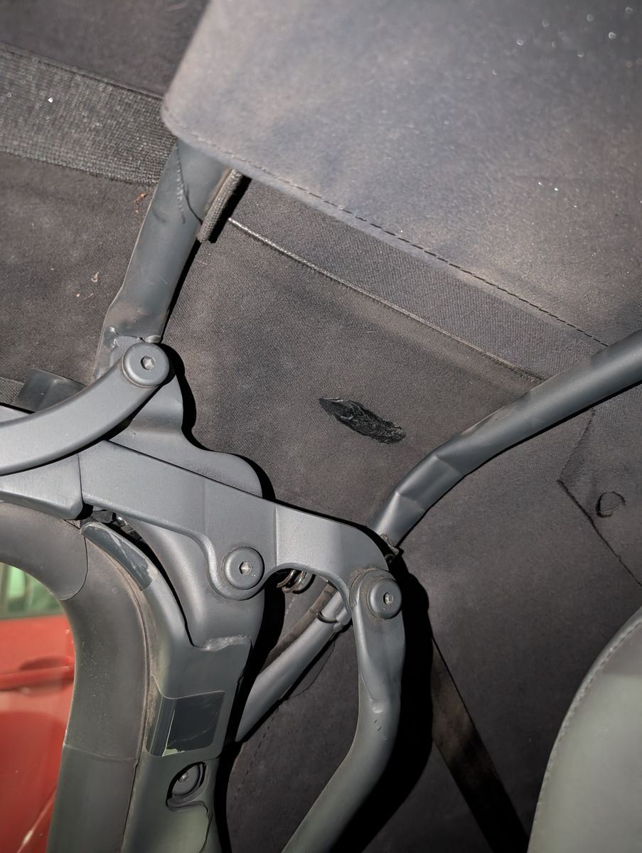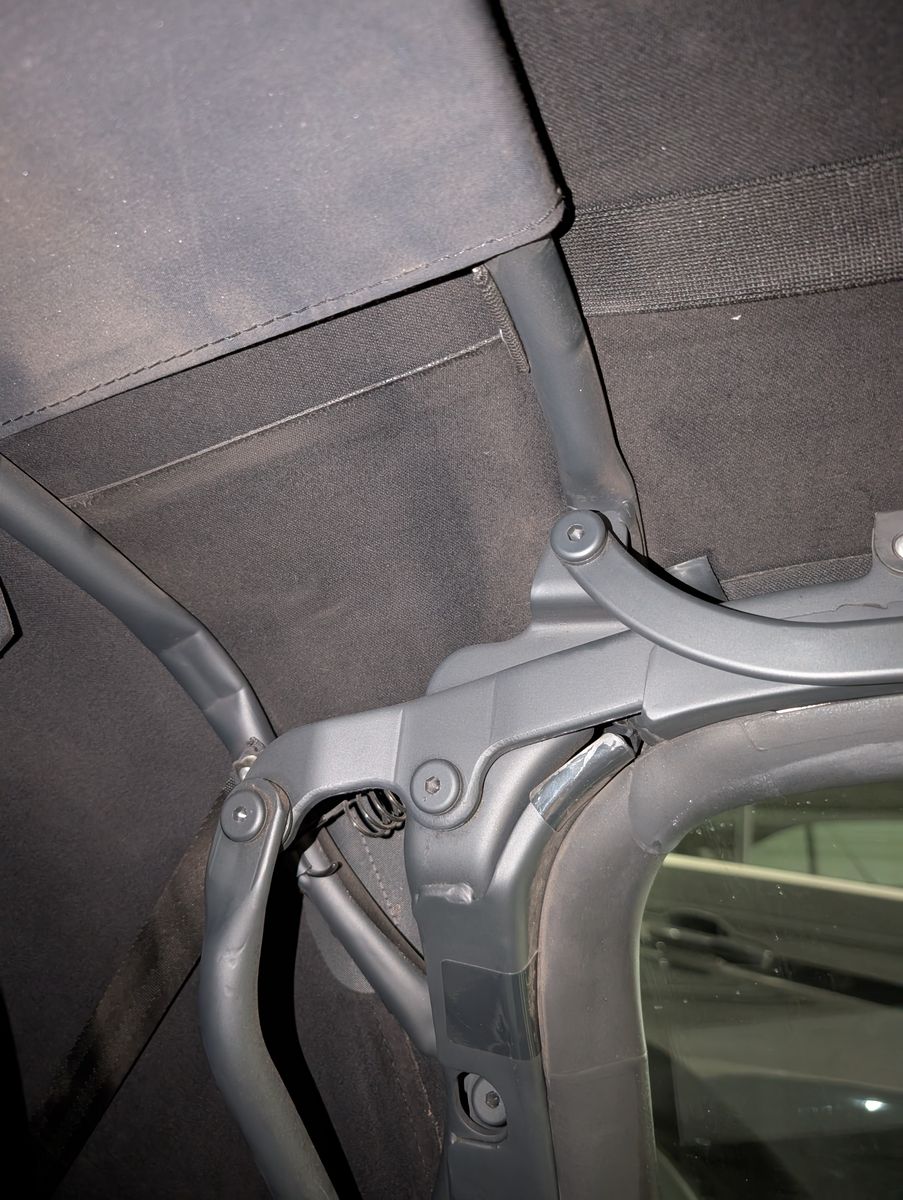 Das mit dem Verdeck ist normal, zumindeste wenn es hinter dem Fenster seitlich oben ist, da scheuert das Gestaenge von innen am Verdeck.